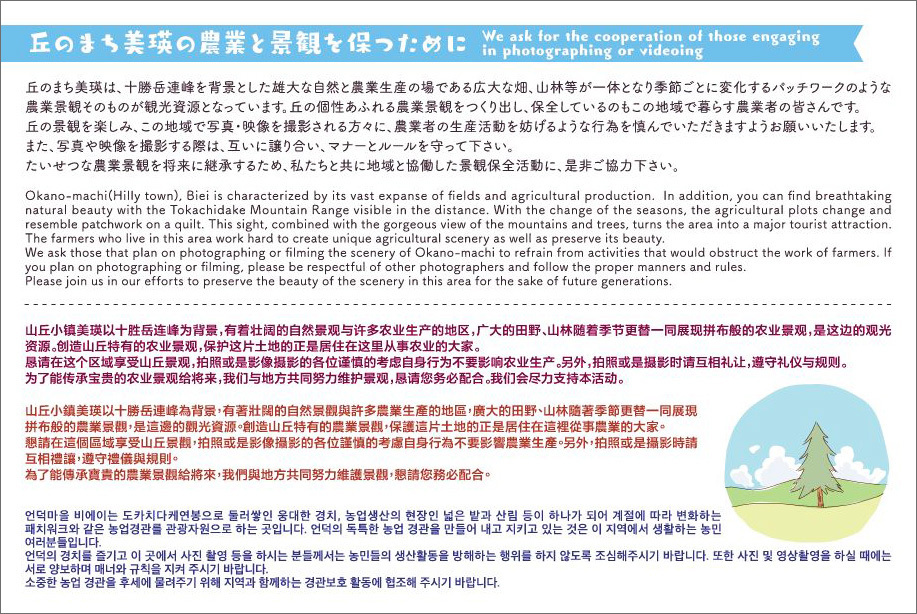 その後、撮影マナー・ルールの周知のためのパンフレットを作成しました。このパンフレットの内容を美瑛町で撮影される方々へ浸透していくことが目的となりますので、皆様も是非周知のほどをよろしくお願い致します。
