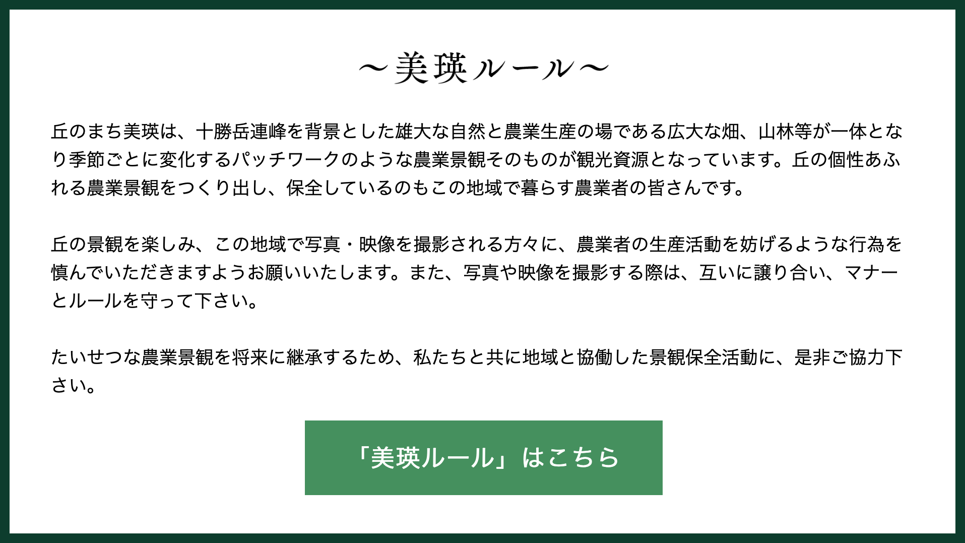 美瑛の撮影マナー「美瑛ルール」を守り、「北海道の自然や生活・農業の営みにより形成されてきたその土地ならではの景観」をテーマに、北海道内で撮影された作品を募集するものです。