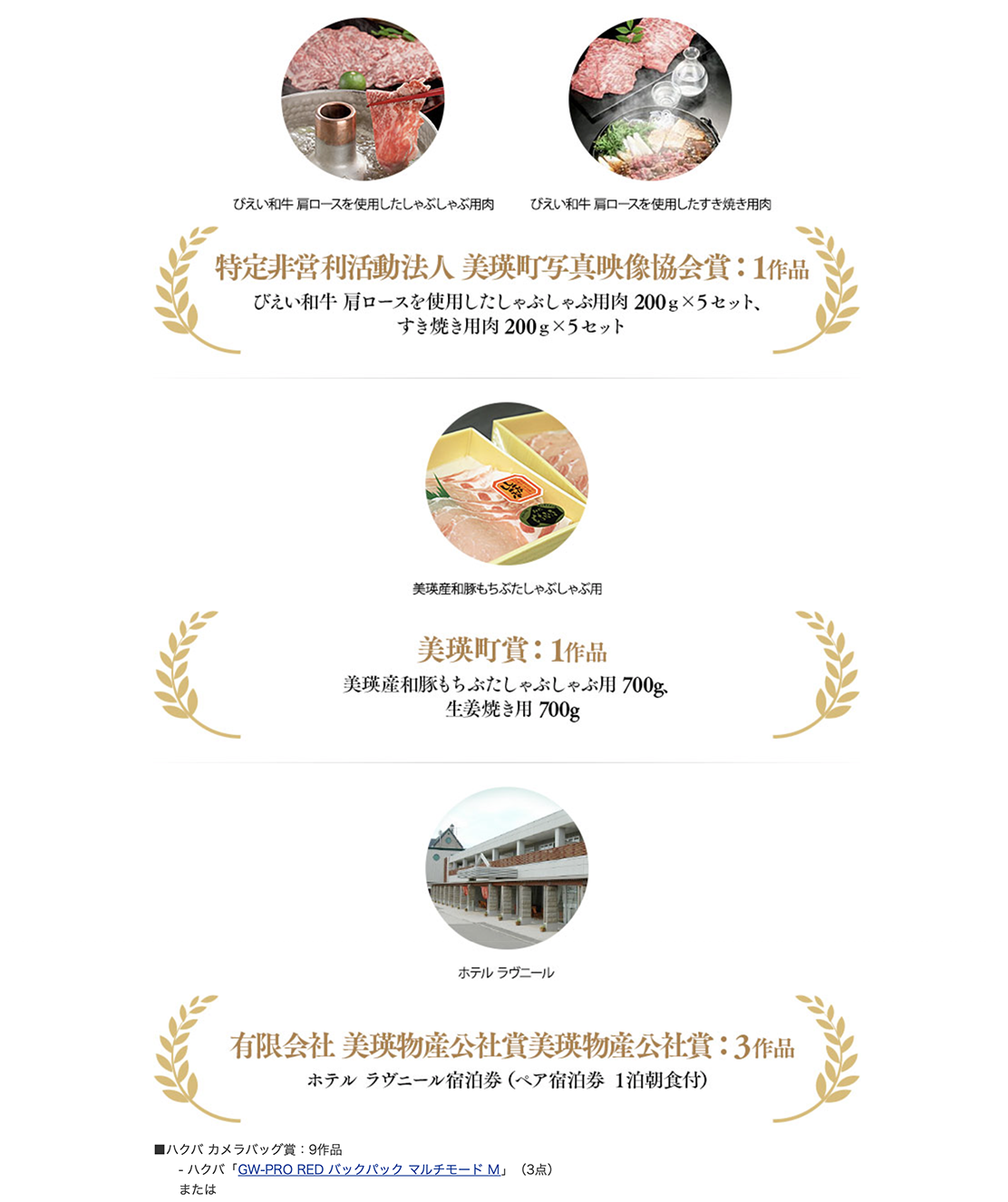受賞者にはカメラメーカーよりカメラバッグや、美瑛町からは美瑛町写真映像協会賞を始め豪華賞品をプレゼント致します。
