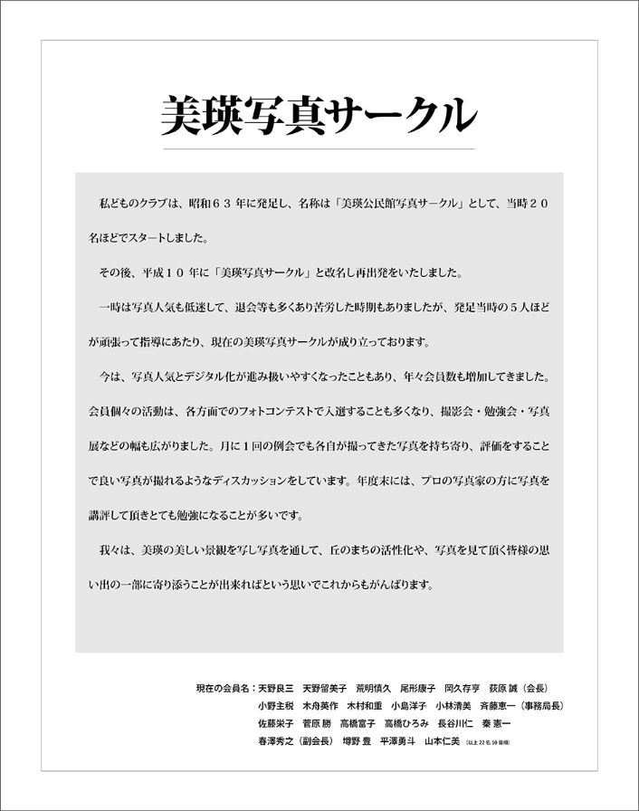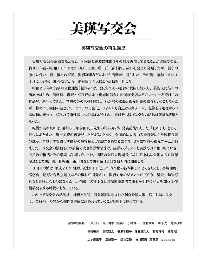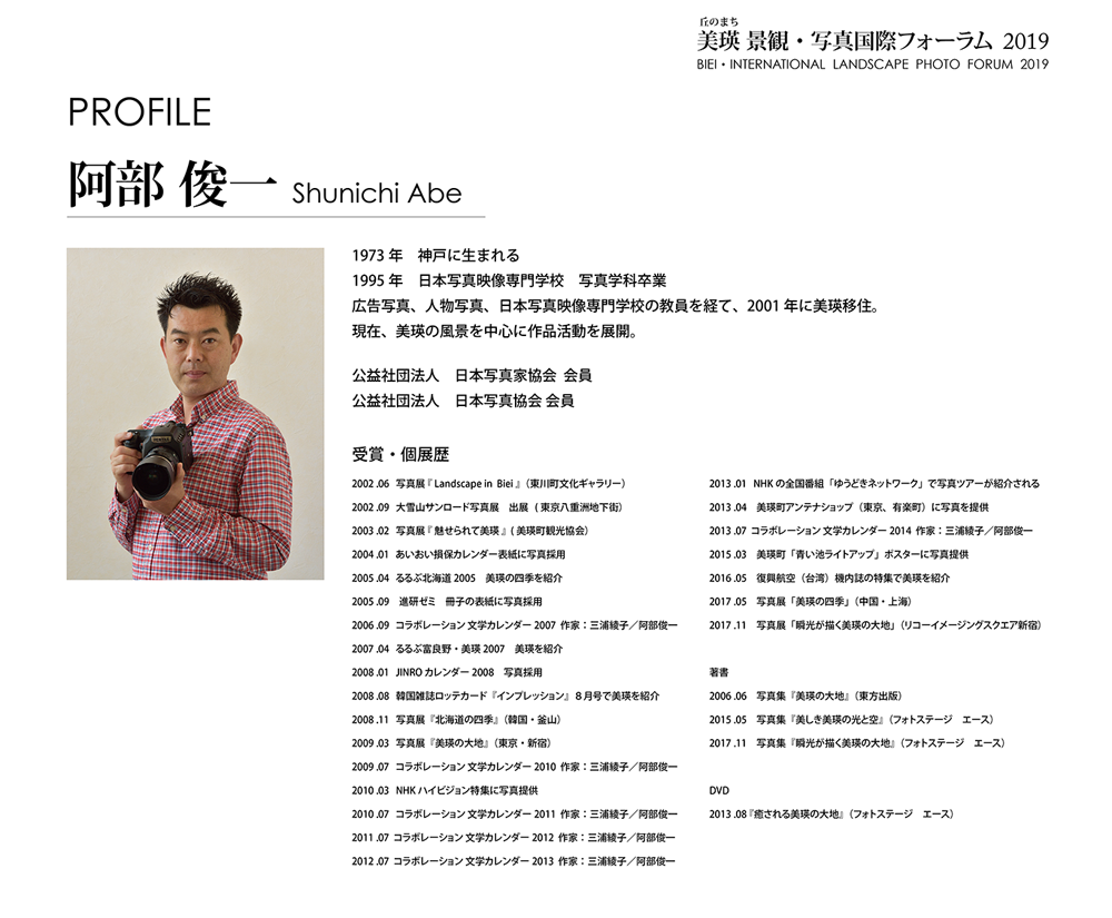 많은 사람들이 비에이의 아름다움을 보기 위해 방문하는 지금, 그 아름다운 풍경을 사진에 담아 다음 세대에 전달하고 사진에 통한 지역 사람들과의 교류가 있는 마을 만들기를 목표로 하고 있습니다.