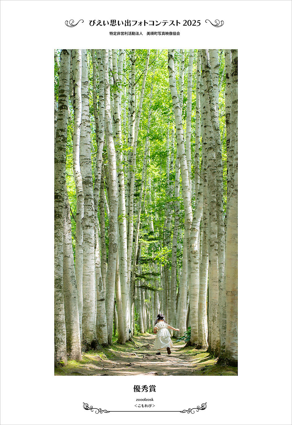 優秀賞 zooolzosk さんの「こもれび」は、白樺並木にいる子供にとても動きがあり、その動きから楽しさが感じられました。